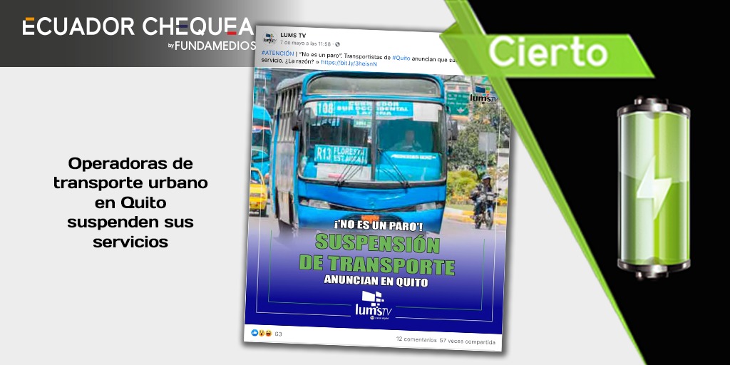 A través de la cuenta de Facebook LUMS TV se ha viralizado una imagen a propósito de la situación del transporte público en Quito de este lunes 10 de mayo de 2021. La publicación indica: “No es un paro. Suspensión de transporte anuncian en Quito”. La imagen fue publicada el 7 de mayo y hoy efectivamente se registra una suspensión de transporte en la capital.
