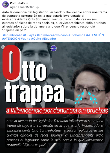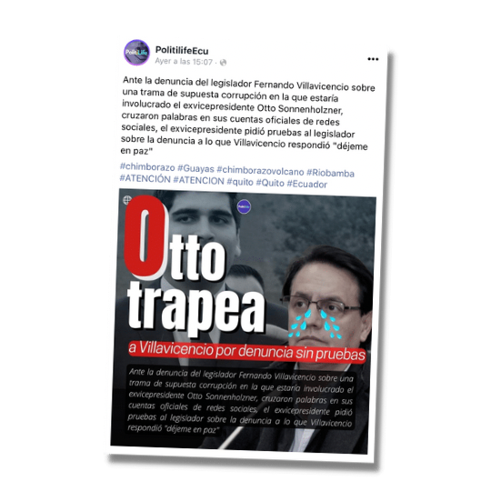 En una publicación de Facebook se asegura que, ante la denuncia del asambleísta Fernando Villavicencio sobre una supuesta trama de corrupción en la que estaría involucrado el exvicepresidente Otto Sonnenholzner, “Otto habría trapeado” a Villavicencio porque pidió al asambleísta pruebas que sustenten su acusación.