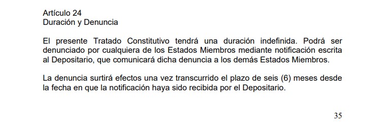 La afirmación de la funcionaria es imprecisa, la denuncia del tratado de UNASUR cumplió con ciertos requisitos antes de ser aceptada y ,hasta el momento, va de la mano con la ley.