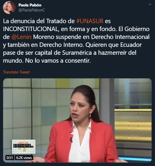 El 24 de septiembre, a través de su cuenta de Twitter la prefecta de Pichincha, Paola Pabón, compartió una aseveración acerca de la denuncia del tratado de UNASUR, en la que afirmó que «la denuncia del tratado de UNASUR es inconstitucional, en forma y en fondo. El Gobierno de Lenin Moreno suspende en Derecho Internacional y también en Derecho Interno».