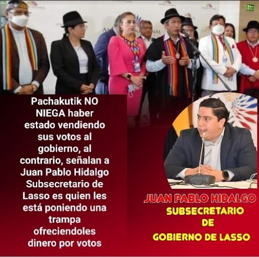 Salvador Quishpe denunció en sus redes sociales que el subsecretario de Articulación Intergubernamental del Ministerio de Gobierno, Juan Pablo Hidalgo, se convirtió en el “hombre del maletín”. Dado que, ha puesto trampas políticas y ha querido comprar asambleístas.