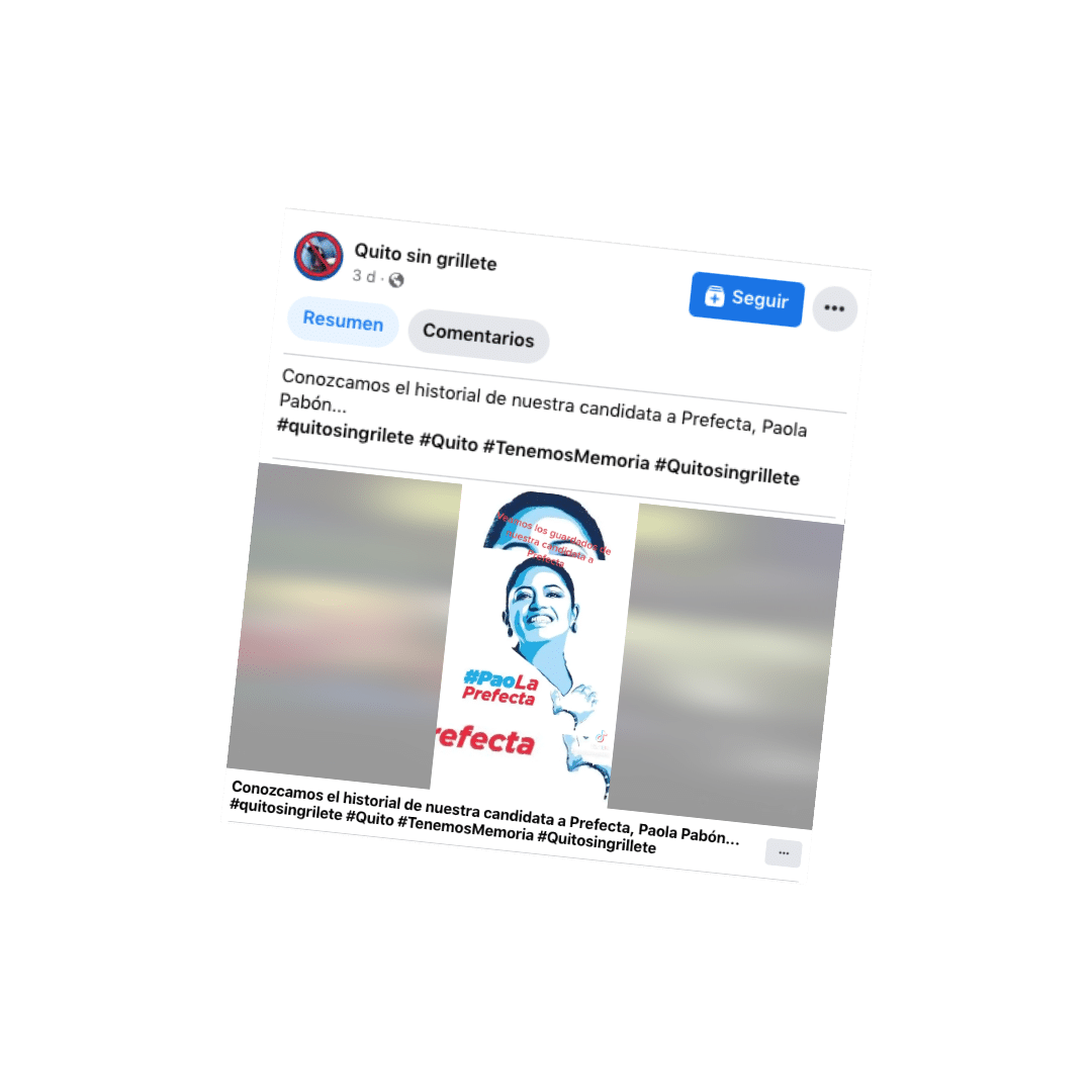 En Facebook se publicó un video que asegura que se presenta un historial de la candidata a la Prefectura por la Revolución Ciudadana, Paola Pabón. En la grabación, se dice: “La corrupta del correísmo busca la reelección”. Y se detalla que contrató un mural de $480.000 con Pavel Egüez, Además, mencionan que Pabón está con grillete y que pasó 3 meses en la cárcel por financiar el paro de 2019 con la Conaie. También se menciona que hackearon las cuentas digitales del dirigente de la Conaie, Apawaki Castro, y que aparecieron supuestas comunicaciones de la prefecta Pabón. Además, se detalla que la funcionaria no trabaja para los quiteños y que obedece órdenes de sus jefes correístas. Calificamos esta información como engañosa, ya que contiene opinión y la candidata ya no usa grillete electrónico.
