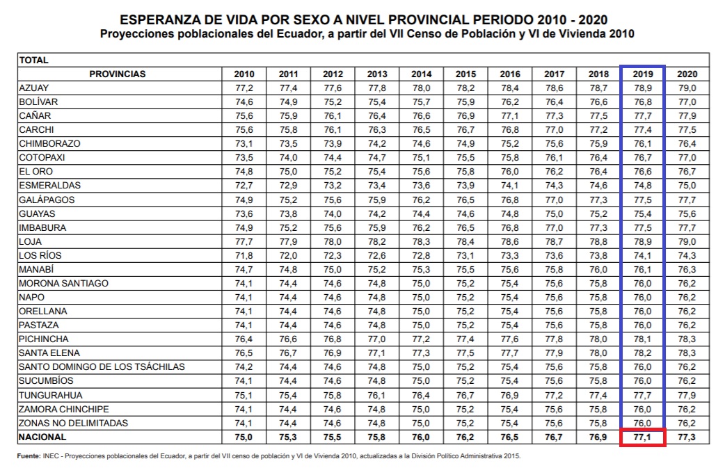 Otro estudio del INEC, Compendio Estadístico 2015, concluye que la esperanza de vida promedio de ecuatorianos y ecuatorianas para 2019 será de 77,1 años.