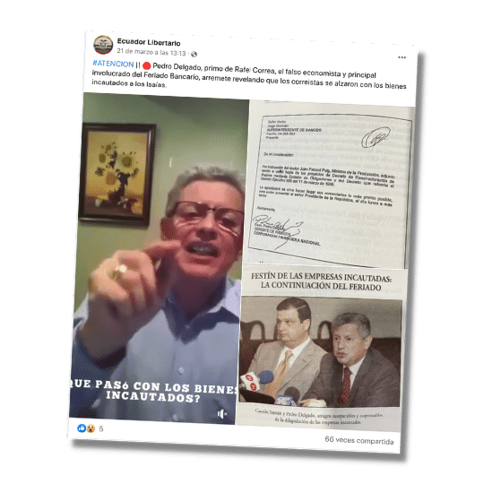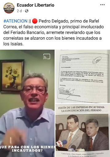 Tras la famosa demanda realizada por los hermanos Isaías al Estado, una página de Facebook publicó un video de Delgado en el que señalaba que los correístas “se alzaron con los bienes incautados a los Isaías”. El post señala a Delgado como el principal involucrado en el Feriado Bancario. Es impreciso. Dado que, Delgado tiene denuncias de peculado y enriquecimiento ilícito. Sin embargo, no se lo tacha de “responsable de feriado bancario”, pero sí tuvo bajo su administración empresas y bienes incautados.