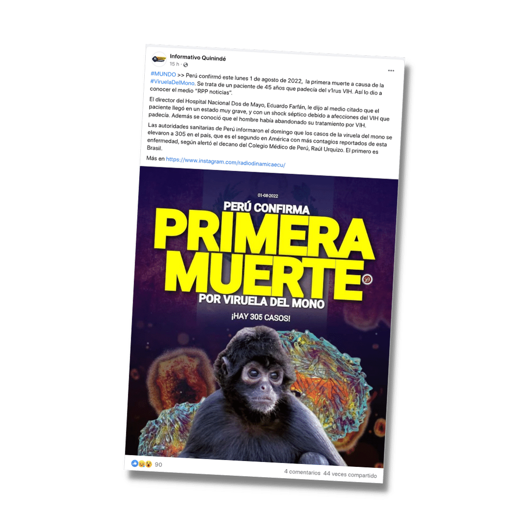 Un post en Facebook asegura que Perú confirma la primera muerte por la viruela del mono. En la descripción de la publicación se menciona que se trata de un paciente de 45 años que padecía del virus de VIH. Además, que el director del Hospital Nacional Dos de Mayo, Eduardo Farfán, señaló que el paciente llegó en un estado muy grave y con un shock séptico debido a afecciones del VIH que padecía. La información es imprecisa, porque aunque el paciente tenía la enfermedad, esta no terminó siendo la causa de muerte.