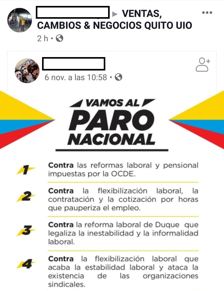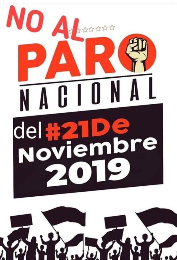 En redes sociales circuló desde el 6 de noviembre una convocatoria para asistir al paro. Sin embargo, la cercanía de las protestas en Ecuador y la similitud en los colores de la bandera de ambos países produjeron confusión. En grupos de Facebook ecuatorianos se comparte la imagen como si se tratase de una convocatoria en Ecuador.
