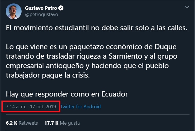 Dirigentes de oposición colombianos, como Gustavo Petro, se hicieron eco de la tesis del «Paquetazo de Duque» y ratificaron su presencia en el el paro.