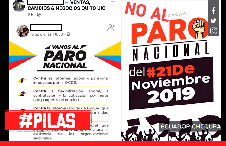 En redes sociales circuló desde el 6 de noviembre una convocatoria para asistir al paro. Sin embargo, la cercanía de las protestas en Ecuador y la similitud en los colores de la bandera de ambos países produjeron confusión. En grupos de Facebook ecuatorianos se comparte la imagen como si se tratase de una convocatoria en Ecuador.