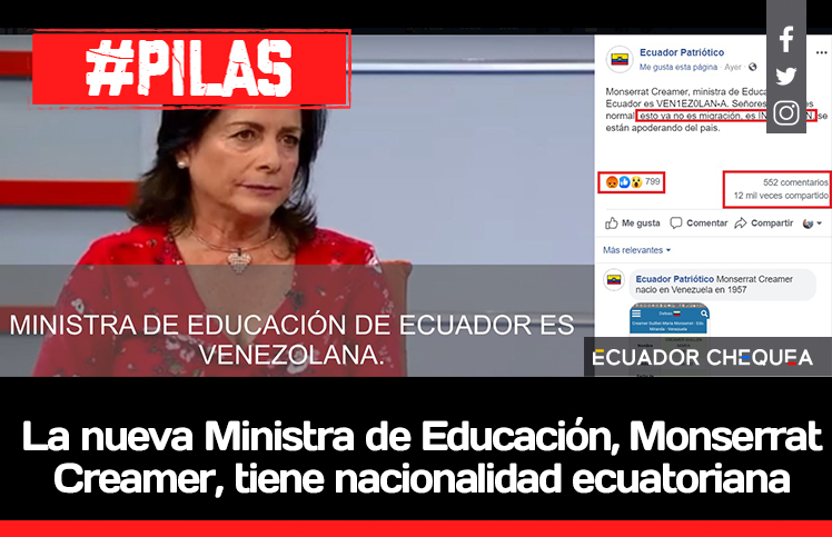 La difusión de información engañosa en redes sociales busca generar xenofobia en Ecuador. En Internet se afirma que la nueva ministra de Educación, Monserrat Creamer, «es venezolana», y distintas páginas, como la cuenta Ecuador Patriótico, acompañaron lo dicho con comentarios en los que advierten que su nombramiento implica una «invasión y se están apoderando del país».