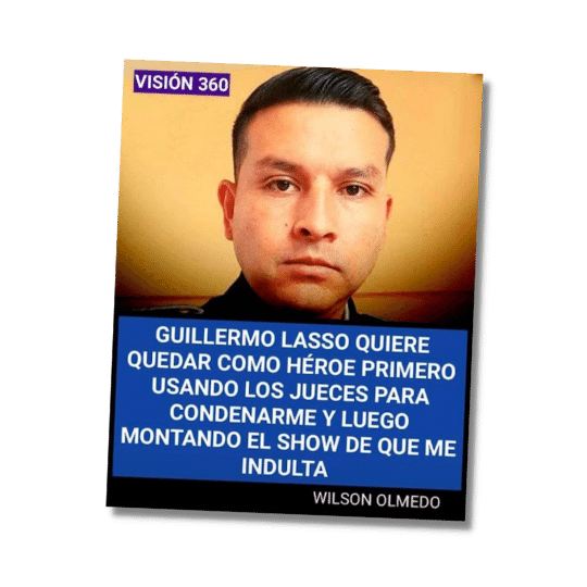 El pasado jueves, la sala Penal de la Corte de Justicia de Chimborazo incrementó, de tres años y cuatro meses a 13 años, la condena por extralimitación en la ejecución de un acto de servicio del policía Santiago Olmedo. En una imagen que circula en redes sociales se afirma que el policía declaró textualmente: “Guillermo Lasso quiere quedar como héroe. Primero usando a los jueces para condenarme y luego montando el show de que me indulta”. Esta información es falsa, el policía sentenciado no ha dado tales declaraciones.