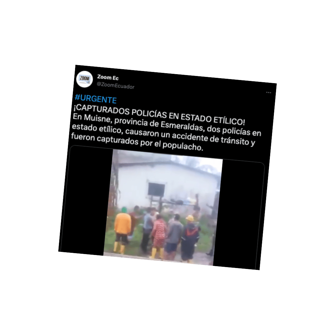 La corresponsal en Esmeraldas de la cadena Ecuavisa, sin embargo, señaló, que en un informe de la Jefatura Política del cantón Muisne sí consta que ambos ocupantes del vehículo policial se encontraban en estado etílico, tal como señalan testigos que se aproximaron a la escena del siniestro.