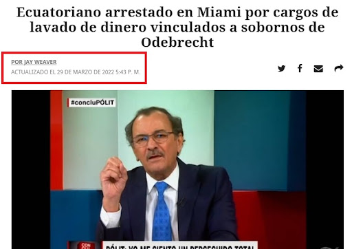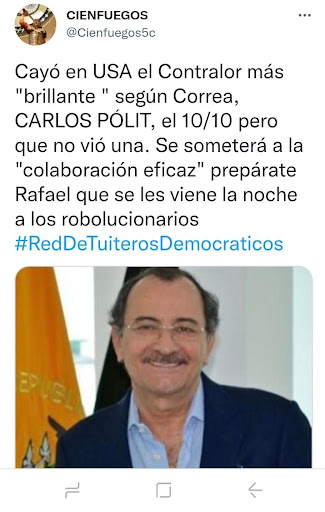 La Fiscalía de Ecuador reportó en su cuenta twitter que “el excontralor Carlos P. fue detenido en los Estados Unidos de América –según información del Departamento de Justicia de ese país (@USDOJ_intl)– y será procesado en el distrito de #Florida, por el delito de lavado de activos (en desarrollo)”.