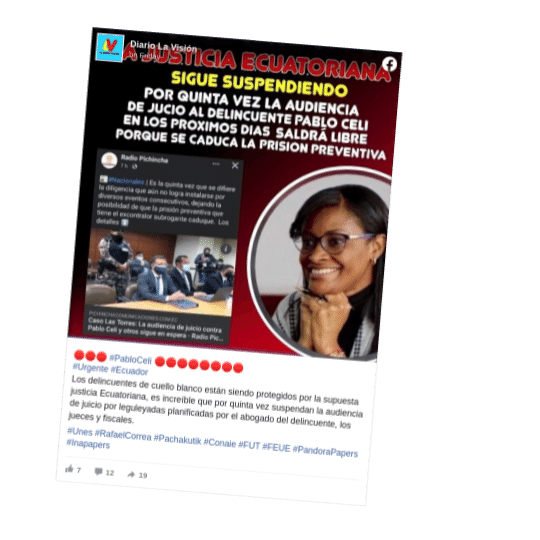 Sin embargo, una publicación en Facebook asegura: “La justicia ecuatoriana sigue suspendiendo por quinta vez, la audiencia al juicio de Pablo Celi. En los próximos días saldrá libre, porque se caduca la prisión preventiva”. La información es engañosa, pues, aunque sí hubo una nueva suspensión, el tema de sus posibilidades de salir de prisión aún no se define.