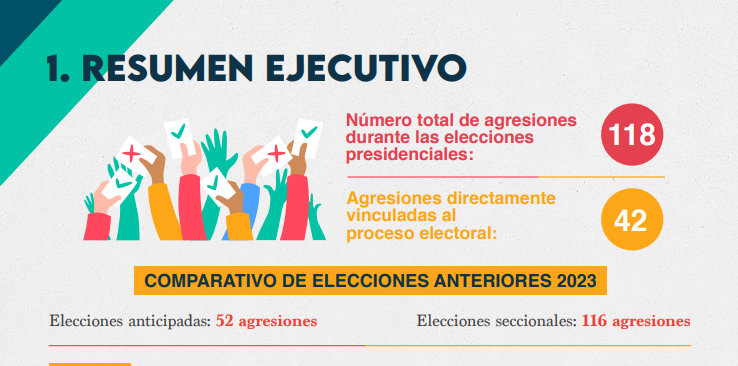 El informe detalla que seis de cada diez agresiones provinieron de actores estatales, incluidos funcionarios públicos y miembros de las fuerzas del orden. El impedimento al acceso a la información fue el tipo de vulneración más frecuente. Ahí, hubo 14 casos, la mayoría registrados durante las jornadas de votación en la primera y segunda vuelta.