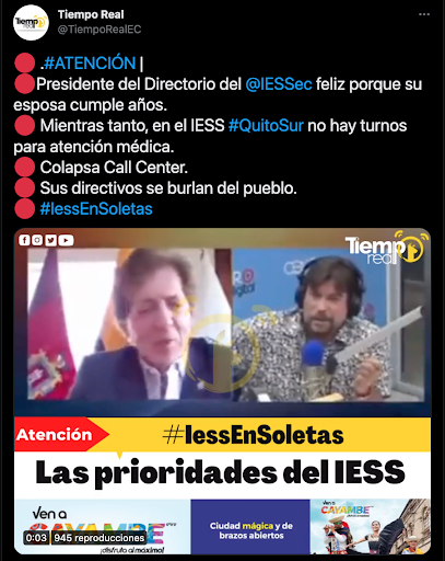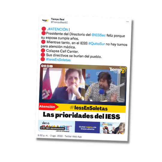 En una publicación de Twitter se asegura que el presidente del directorio del IESS, Alfredo Ortega Maldonado, se burla del pueblo al considerar que estaba feliz por el cumpleaños de su esposa, pese a las carencias descritas. Además, el post sugiere que esa es una prioridad para el funcionario, antes que la solución de los problemas a los que se enfrenta la institución. Esta información es falsa.