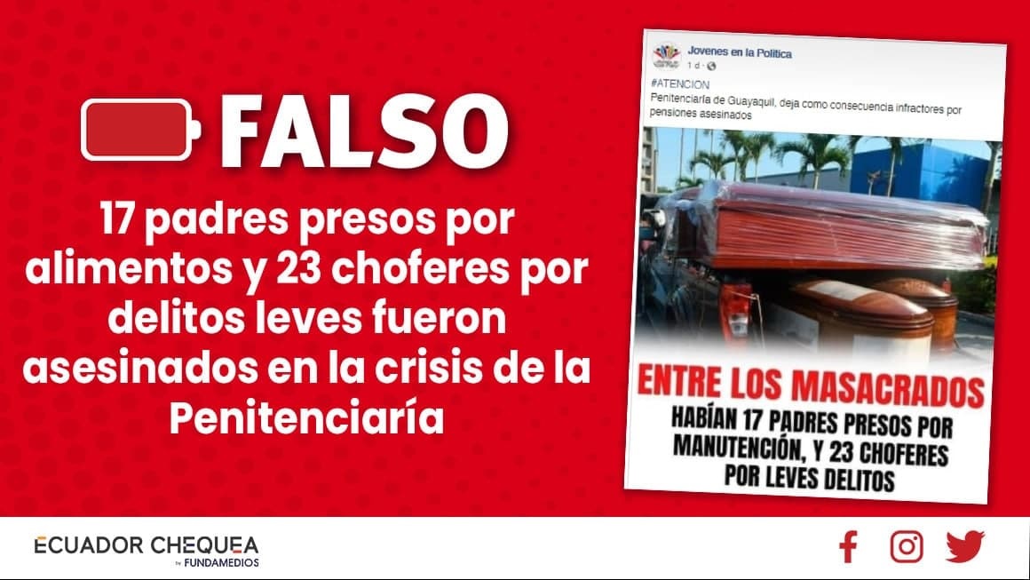 El 28 de septiembre se produjeron motines dentro de la Penitenciaría del Litoral y el Servicio de Rehabilitación Social (SNAI) reportó que 118 personas perdieron la vida. En ese contexto, se difundió supuesta información de que entre las personas masacradas habrían estado 17 padres presos por alimentos y otros 23 choferes por delitos leves. La información es falsa.