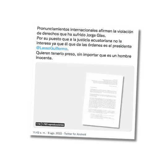 Una publicación en Twitter menciona que pronunciamientos internacionales afirman la violación de derechos que ha sufrido Jorge Glas. “Por supuesto que a la Justicia ecuatoriana no le interesa, ya que el que da las órdenes es el presidente, Guillermo Lasso. Quieren tenerlo (a Glas) preso, sin importar que es un hombre inocente”, señala la publicación. La información es falso.