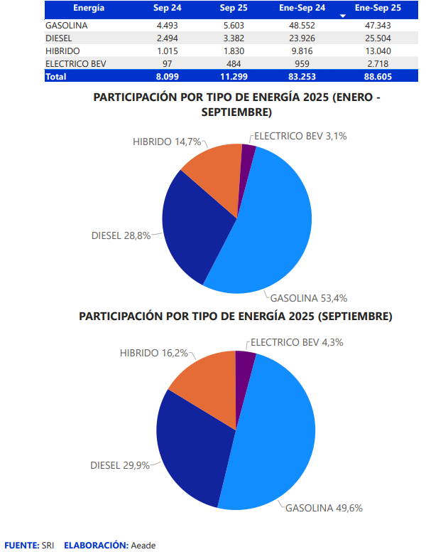 De acuerdo con la Asociación de Empresas Automotrices del Ecuador (AEADE), los vehículos a diésel representaron el 28,9% de las ventas de vehículos nuevos entre enero y septiembre de 2025, con un incremento del 35,6% respecto al mismo periodo de 2024.