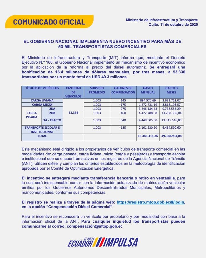 Según el Ministerio de Transporte y Obras Públicas (MTOP), la medida requerirá una inversión de alrededor de USD 50 millones durante tres meses, destinados a 53.336 transportistas de carga, escolar e institucional. Los beneficiarios deben registrarse en la plataforma oficial del MTOP: https://registro.mtop.gob.ec/#/login.
