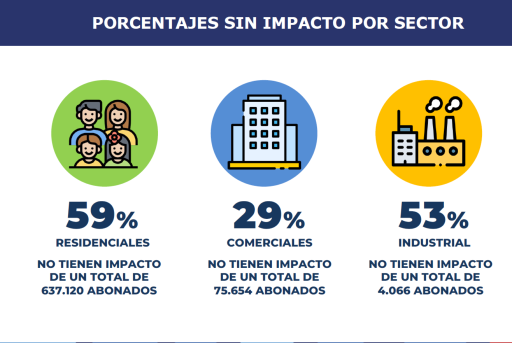 Muñoz dijo que un 59 % de un total de 715.000 abonados no tendría impacto con el nuevo modelo. Por sectores, el porcentaje sin impacto es de 59 % para residenciales, 29 % para comerciales y 53 % para industriales, según los gráficos de la presentación.