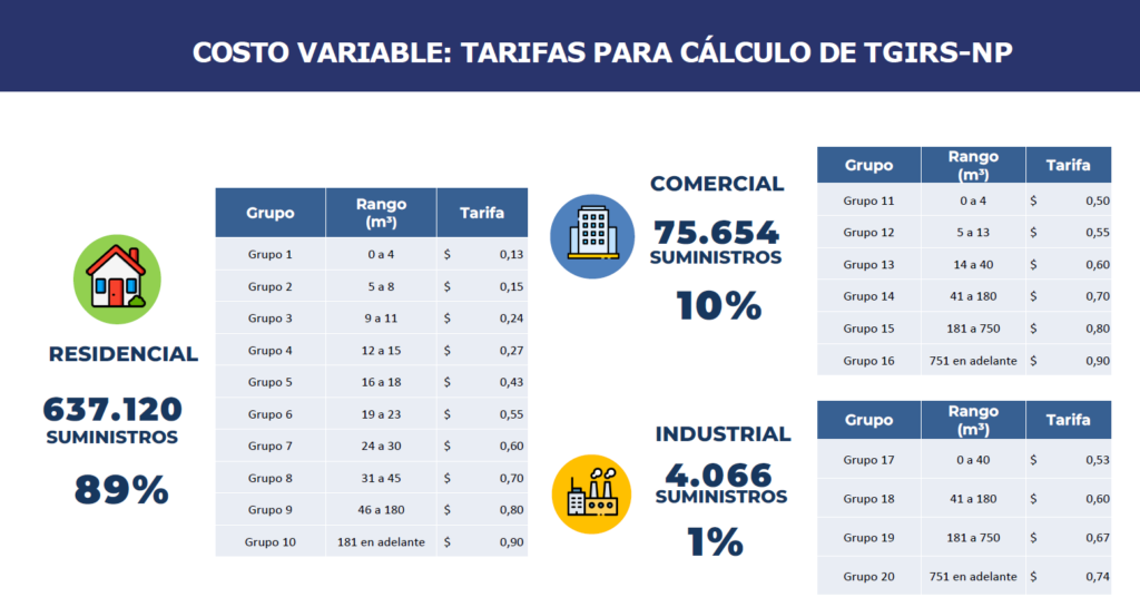 Las tarifas variables se organizan por rangos de consumo y por tipo de usuario: residencial, comercial y otros, e industrial. En total, se incluyen 10 grupos residenciales, 6 comerciales y 4 industriales, con tarifas que van desde USD 0,13 hasta USD 0,90 por m³ según el rango de consumo.
