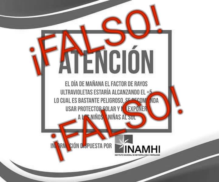 La radiación en Quito genera problemas. De hecho, a inicios de esta semana se difundió en redes sociales una imagen con un supuesto comunicado del Instituto Nacional de Meteorología e Hidrología (INAMHI) sobre la Radiación Ultravioleta (UV) en la ciudad. De acuerdo al anuncio, el índice de UV alcanzaría el nivel 5. Sin embargo, en la publicación no se especifican fechas ni explicaciones técnicas sobre el fenómeno climático. En ese contexto, la noche de este 13 de marzo, el INAMHI manifestó que la publicación es falsa.