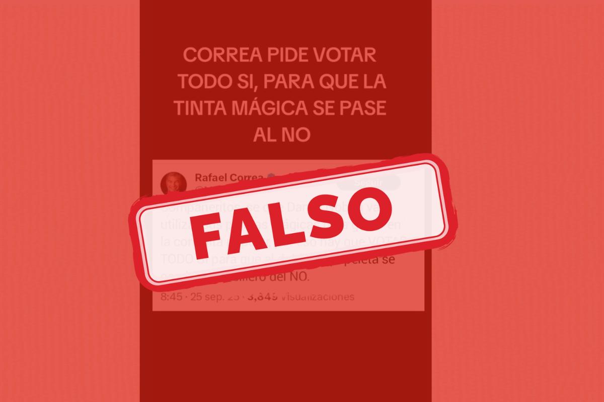 - Lo que afirma: Que Correa escribió: “Compañeritos, sé que Daniel Noboa va a utilizar sus plumas mágicas para ganar en la consulta popular, por eso hay que votar TODO SÍ para que al doblar la papeleta se cambie al casillero del NO”.