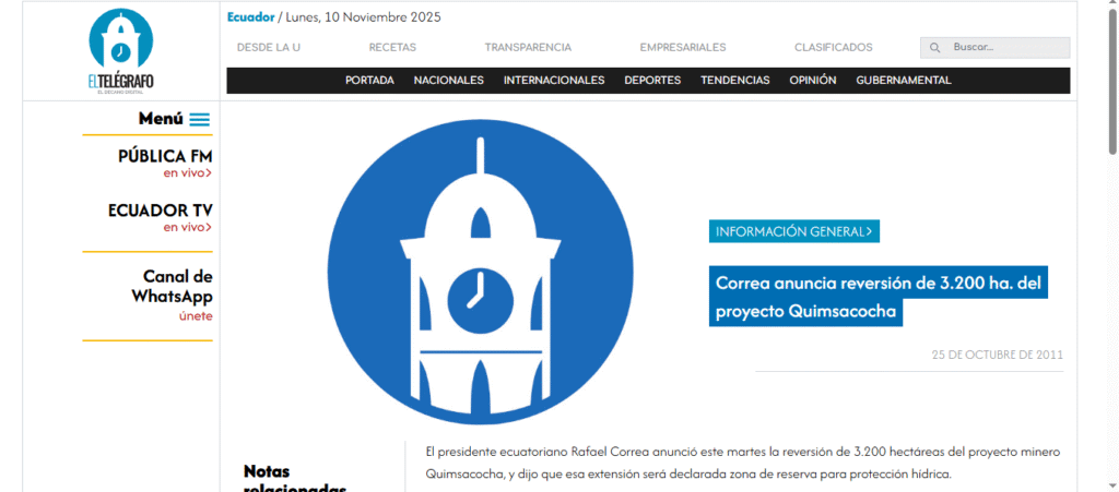 Aunque el correísmo promovió otros proyectos de minería a gran escala, el caso de Quimsacocha fue distinto: la compañía se retiró del país tras años de resistencia social y disputas con el Estado.