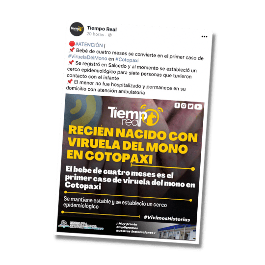 Una publicación en Facebook menciona que un recién nacido tiene viruela del mono en Cotopaxi. Además, el menor tendría 4 meses y es el primer caso de la enfermedad en esta provincia. La información es cierta.