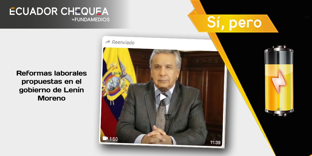 A través de WhatsApp circula un video que asegura que el presidente Lenín Moreno tiene lista una reforma al Código del Trabajo y menciona algunas medidas que esta incluiría. La información es engañosa porque enumera reformas que sí se han debatido en el actual gobierno, pero no se han concretado. Además, en los últimos días, las autoridades han indicado que solo harán recomendaciones sobre una reforma laboral que podría ser o no aplicada por el siguiente presidente Guillermo Lasso.
