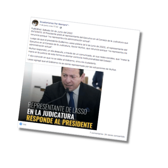 Una publicación en Facebook asegura que el representante del presidente, Guillermo Lasso, en la Judicatura responde a su pedido de que renuncie. En la descripción del contenido se especifica que Lasso pidió al representante del Ejecutivo en el Consejo de la Judicatura que renuncie, porque no representa a la administración actual. Además, se señala que el vocal del Consejo de la Judicatura, Xavier Muñoz respondió al mandatario que pedir su renuncia es “meter la mano en la Justicia y atentar contra la institucionalidad del Estado”. La información es engañosa. Pese a que sí se dio el pedido de renuncia, y también la respuesta del consejero, él no es representante del Ejecutivo. En esta nota ampliamos esta explicación.