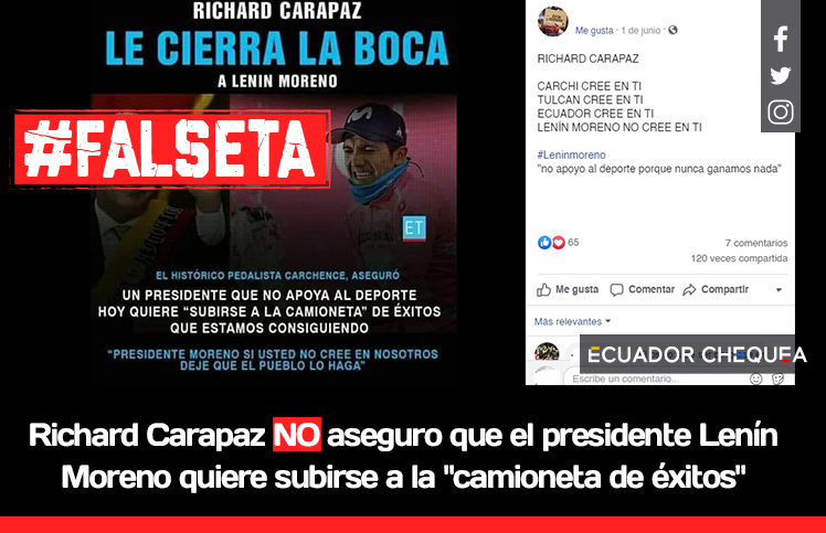 Las publicaciones engañosas afirman que el deportista ecuatoriano dijo al Primer Mandatario que: «un presidente que no apoya al deporte hoy quiere subirse a la camioneta de los éxitos que estamos consiguiendo». En el post se incluye un logo similar al de Diario El Comercio; sin embargo, este medio no publicó ningún contenido similar al expuesto en redes sociales entre 1 y 2 de junio.