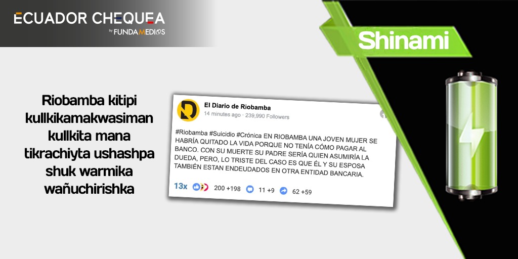8 raymi killapi 2021 watapa El Diario de Riobamba Facebook pankapimi shuk willayta yallichirka “Riobambamanta warmi wañushka kullkikamaywaman mana kullkita tikrachinkapak ushashpa”. Nancy R. shutiwan shuk warmi wañushkami, paypa mamami willachiy tantanakuykunaman nirka kullkikamaywasipi mana pagankapak ushashpami llakita apashka.