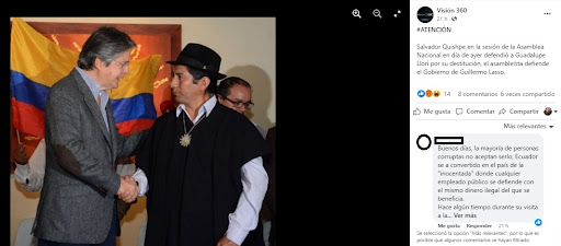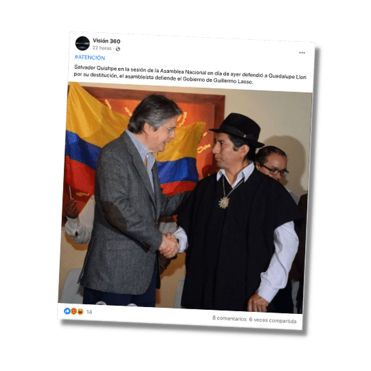 En el marco de la destitución de Guadalupe Llori como Presidenta de la Asamblea Nacional se difundió que Salvador Quishpe defendió a Llori y apoya al Gobierno de Guillermo Lasso. La información es falsa, Quishpe aseguró que el apoyo del Gobierno a Llori no les beneficia y que ni Pachakutik ni Llori lo necesitan. Lo que sí defendía era el puesto que su partido logró en la Presidencia del Legislativo.