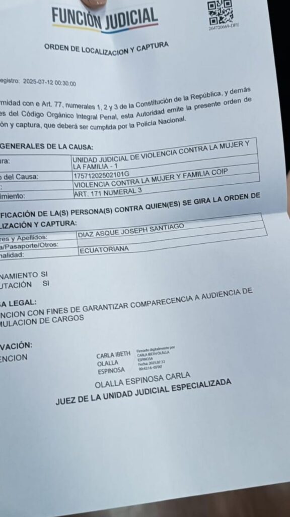 La orden fue emitida por la jueza de la Unidad Judicial de Violencia contra la Mujer y la Familia, Carla Olalla, con el objetivo de garantizar la comparecencia de Díaz a la audiencia de formulación de cargos.