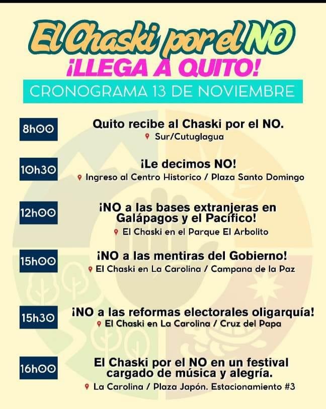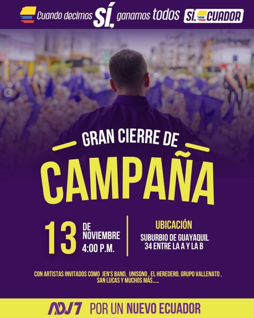 El principal acto de campaña electoral de promoción del Sí se desarrolló en la ciudad de Guayaquil con la presencia del presidente, Daniel Noboa y varios altos funcionarios del gobierno. En Quito, hasta el cierre de esta edición se esperaba que arribe el denominado “El Chaski por el No” organizado y liderado por la Confederación de Pueblos de la Nacionalidad Kichwa del Ecuador (Ecuarunari)