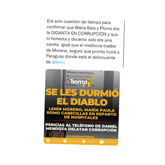 Tras esta información, un usuario de Twitter publicó que se confirmó que el expresidente, Lenín Moreno y su exministra de Gobierno, María Paula Romo, participaron en el reparto de hospitales. Esto, tras pericias al teléfono de Mendoza. La información es engañosa. No se ha confirmado nada. El asambleísta por el correísmo Ronny Aleaga apenas presentó a la Fiscalía supuestos archivos de conversaciones entre Mendoza y Romo, en los que se les implicaría una entrega de cargos a cambio de favores políticos.