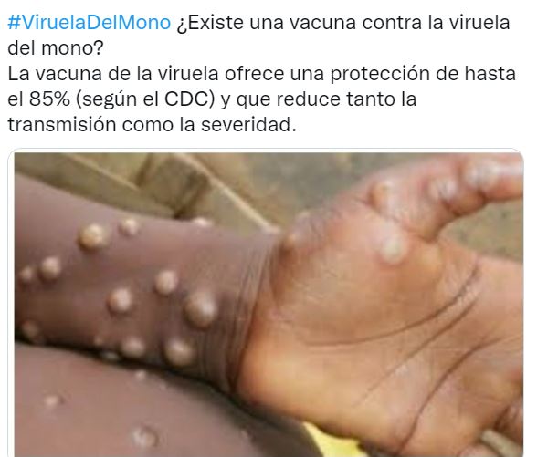 Varios contenidos se han publicado en Facebook y aseguran que existe un contagio de una enfermedad llamada viruela del mono que se contagia de animales a humanos. En una publicación en Twitter se cuestiona si existe una vacuna contra esta enfermedad y se afirma que, según los Centros de Control y Prevención de Enfermedades (CDC), la vacuna de la viruela ofrece una protección de 85% y reduce la enfermedad de la viruela del mono. La información es cierta.