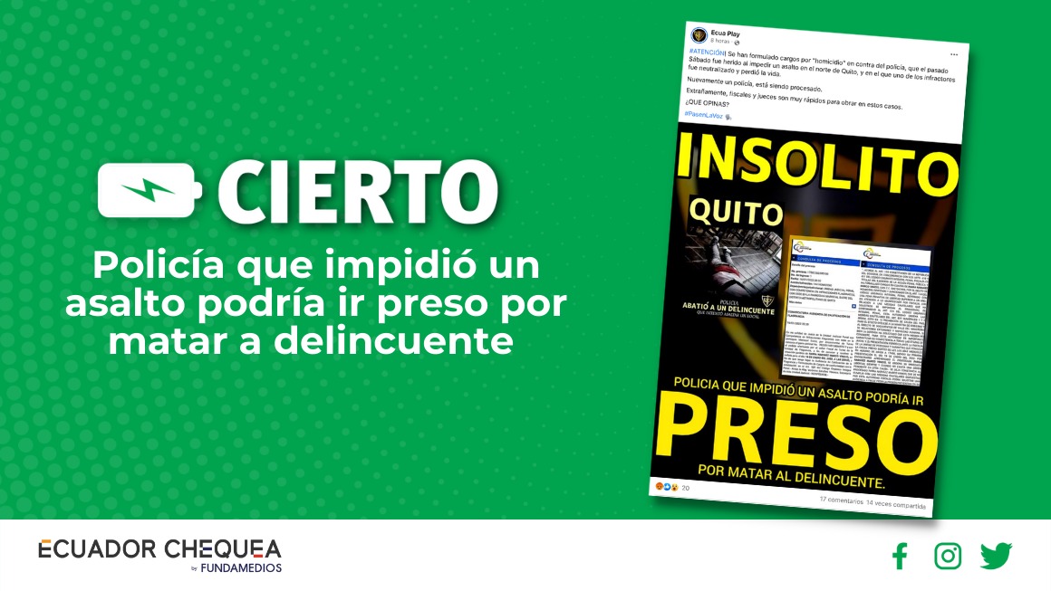 Y en la cuenta de Facebook Ecua Play se publicó que un policía que impidió un asalto en el norte de Quito podría ir preso por matar al delincuente.