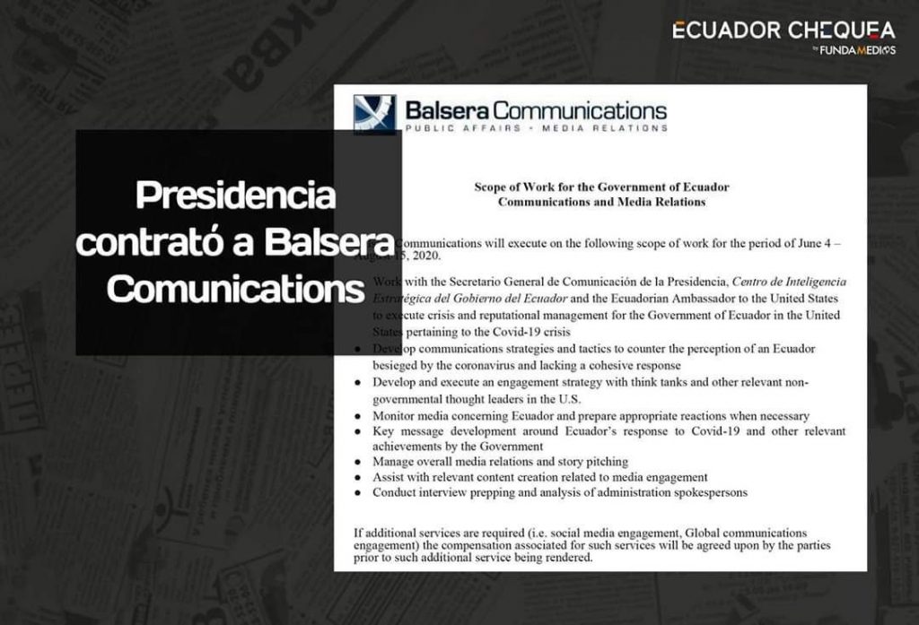 Ashtawanpash, kay COVID-19 llaki unkuy pachapi kullkita kunakun nishpa. Ecuadormanta Secretaría General de Comunicaciónpash (Segcom) chay contratomanta willachirka. Chayta rurarirka “llullakunata, mana allí willaykunata harkankapak, kay llaki unkuypachapi, mana allí rikurikpika mana ima yanapayta charita usharinchu” Segcom nin, karu mamallaktakunapi shuktak willaymi chayakun “ mana alliyachashka willay”, Maykan llulllay ashtawan llullaykuna kuyurirka, ecuadorpi wañushkakuna ñankunapi sakinakun, Guayaquilpi ayapampata rurakun tukutkunata chaypillatak pampankapak, nishpa. 29 panchi killamanta, 16 aymuray killakamanka, 336 llullakunatami kay kamaywasika tarishka. Shinapash, kay llamkayka ashtawan kashka yanapankapak, pakta ima llamkaypi kankapak, shinallatak Balsera Communicationsman willachinkapak imatatak Ecuadorpa pushak paktachikun kay llaki unkuypachapi.