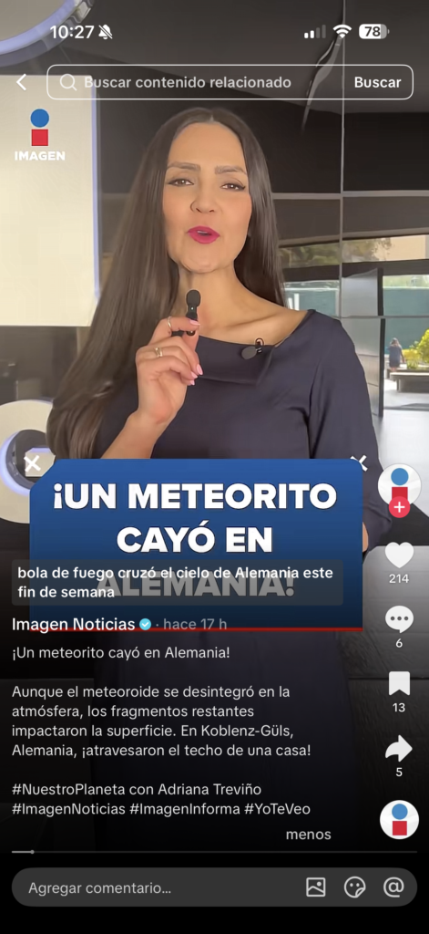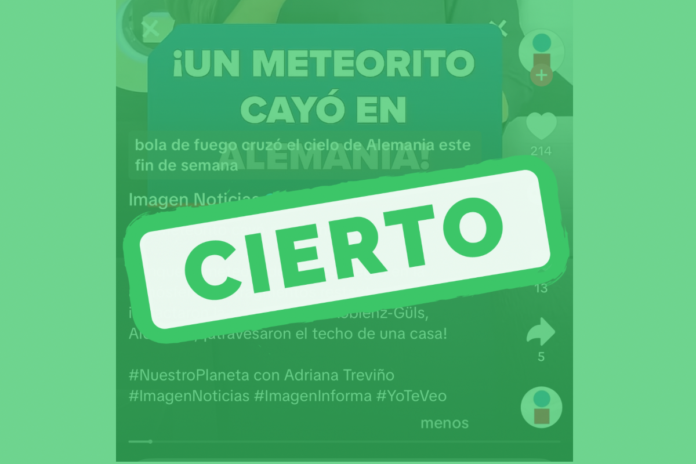 Un video en TikTok, describe: “¡Un meteorito cayó en Alemania!” y, en el texto de apoyo, se asegura que una “bola de fuego cruzó el cielo de Alemania este fin de semana” y que fragmentos del objeto impactaron una vivienda en Koblenz-Güls.