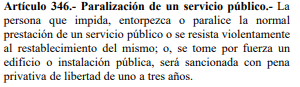 Al dirigente indígena se lo acusa por paralización de un servicio público. El artículo 346 del COIP indica que quien impida o paralice la normal prestación de un servicio público, o se resista al restablecimiento del mismo de manera violenta, “o, se tome por fuerza un edificio o instalación pública, será sancionada con pena privativa de libertad de uno a tres años”.