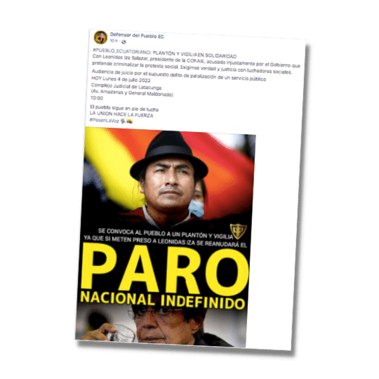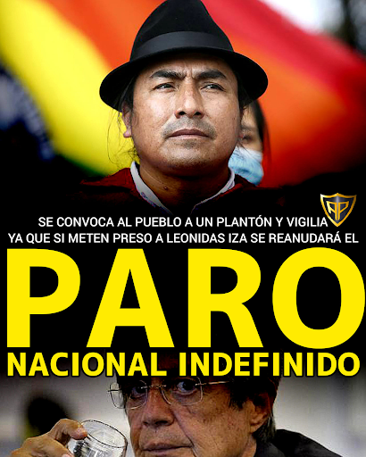 En Facebook, circula una imagen en la que asegura, que si meten preso a Leónidas Iza se reanudará el paro nacional indefinido, está información es falsa.