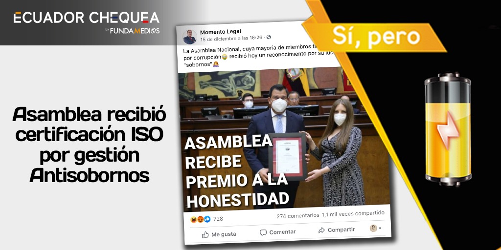 Desde el 15 de diciembre circula en Facebook una publicación que afirma que: La Asamblea Nacional recibe un premio a la honestidad. Si bien es cierto que en esa misma fecha el órgano legislativo del Ecuador recibió un reconocimiento, este no corresponde necesariamente a la honestidad dentro de la institución. El reconocimiento se dio porque la Asamblea aprobó los requisitos para obtener una certificación ISO 37001.