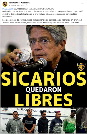 En Facebook circula una publicación que asegura que dos de los tres sicarios detenidos, por “ser parte de una organización delictiva dedicada al sicariato en Manabí”, fueron liberados. Los operadores de justicia habrían dictado medidas sustitutivas a la prisión. Además, se asegura que la Policía Nacional hizo un llamado a los jueces para que se sancione correctamente a quienes cometen delitos”. La información es falsa.
