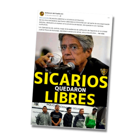 En Facebook circula una publicación que asegura que dos de los tres sicarios detenidos, por “ser parte de una organización delictiva dedicada al sicariato en Manabí”, fueron liberados. Los operadores de justicia habrían dictado medidas sustitutivas a la prisión. Además, se asegura que la Policía Nacional hizo un llamado a los jueces para que se sancione correctamente a quienes cometen delitos”. La información es falsa.