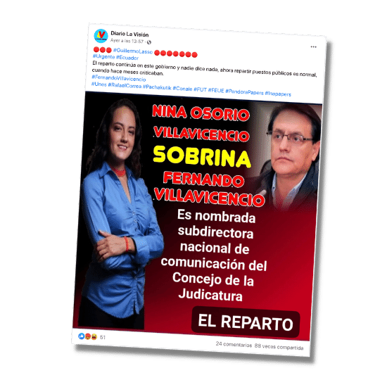 Ecuador Chequea se comunicó con Fernando Villavicencio para conocer su respuesta sobre el tema. Sin embargo, no respondió. En una entrevista concedida esta mañana, Villavicencio fue interrogado sobre Osorio. Allí confirmó que se trataba de su sobrina y dijo: “Es una excelente periodista y quiero felicitar al Consejo de la Judicatura por haberle contratado, pero yo no tengo nada que ver”.