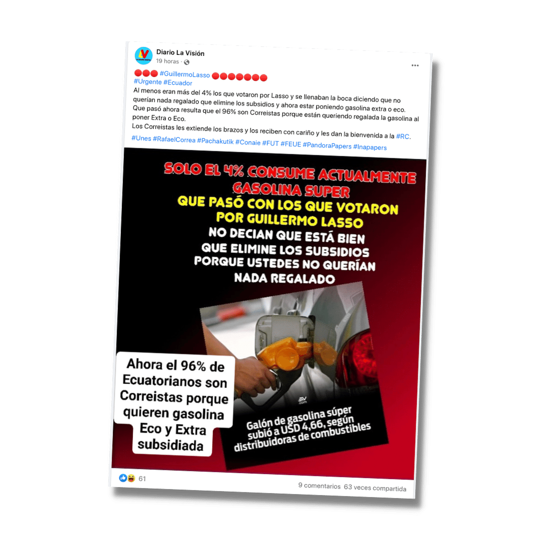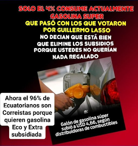 Este 12 de abril subió su precio a USD 4,66; es decir, USD 0,68 más que el anterior. Con esta información, una página de Facebook publicó que sólo el 4% de la población consume gasolina súper. Mientras que, el 96% consume gasolina extra y ecopaís, que está subsidiada. Además, se pregunta qué pasó con quienes votaron por el presidente, Guillermo Lasso, y sugiere que, como ahora la mayoría consume la más económica, se volvieron correístas. Calificamos este post como impreciso porque, aunque la cifra se acerca a una medición oficial, no es exacta y el resto de la composición muestra una clara intencionalidad política.