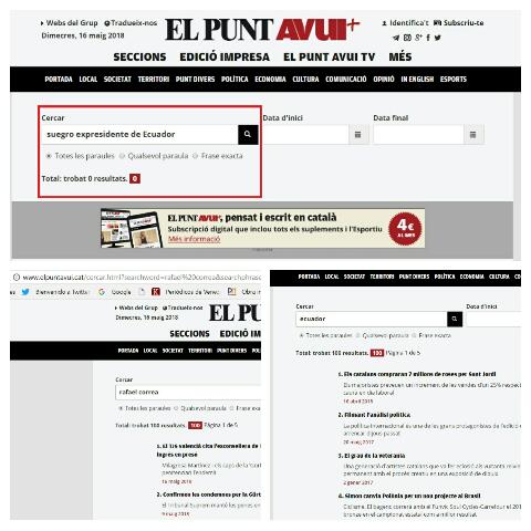 La publicación que circula está compuesta por una portada del diario catalán ‘El Punt Avui‘, sin embargo, en la web del medio las palabras «Rafael Correa«, «Ecuador«, «Suegro expresidente Ecuador» no arrojan ningún resultado. Es decir, no se ha publicado ninguna información en torno al tema.