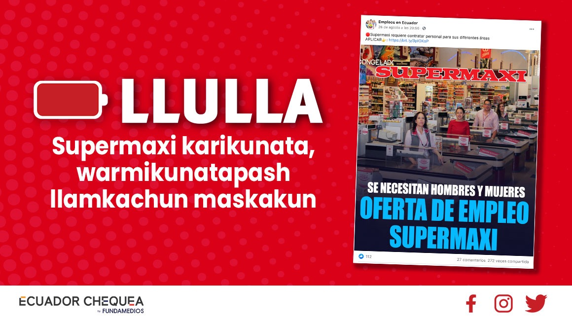 Facebook pankapimi shuk willayta llukchinakun Supermaxi llamkayta kari shinallatak warmikunata kukun nishpa. Chay willayka llullami kan Coorporación favorita, Supermaxita charik, mana ima llamkaykunamanta redes socialespi llukchishkachu.